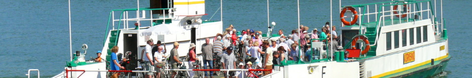 Radfahrer, letztmals in dieser Saison, die Möglichkeit, von der Altrheininsel Kühkopf direkt zum Anleger in Guntersblum zu kommen und im Dorfgemeinschaftshaus Guntersblum (Mühlstraße 45)